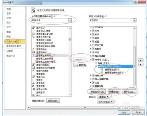 3.出现“word选项”对话框,选择:自定义功能区→将“常用命令”切换到“所有命令”,找到“查看尾注分隔符”以及“查看尾注连续分隔符”命令;选择“新建选项卡”并重命名(假设为“哈哈哈”)→“新建组”重命名为“尾注”,添加到“哈哈哈”栏,确定,如图所示。注意要先新建选项卡,再新建组,最后再选中“查看尾注分隔符”,点击“添加”。“查看尾注连续分隔符”操作同上。