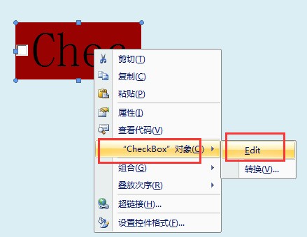 二、右键点击复选框,菜单内点击“对象”,子菜单内点击“Edit”编辑复选框内的文字。