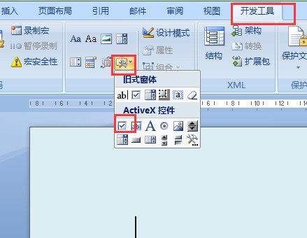 一、打开Word,进入“开发工具”,点击“旧式窗体”,下拉菜单内点击“复选框”。