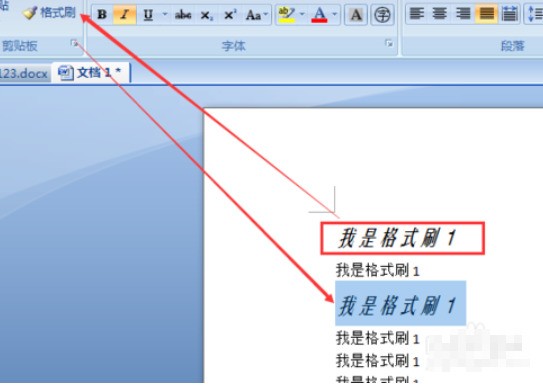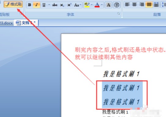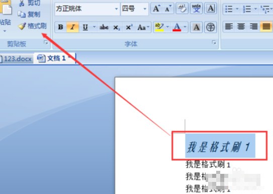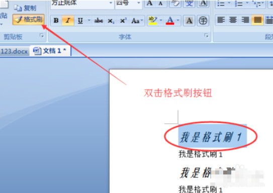 3、如果是单次格式化其他文本,我们可以选中原来文本, 点击"格式刷"按钮, 然后选中需要格式的文字即可。