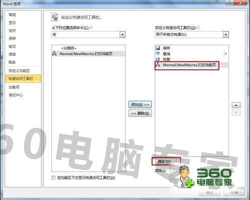 4. 这时“Normal.NewMacros.打印当前页”显示在右边窗口,单击“修改”按钮