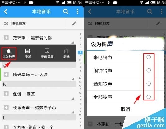 2、出现设为铃声,添加,歌曲信息,删除,点击“设为铃声”,出现来电铃声,闹钟铃声,通知铃声,全部铃声,各人可根据自己的需要来设置;
