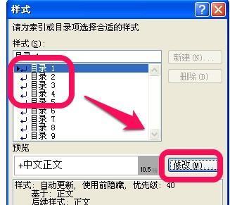 2、插入目录的设置弹出框后,点击右下角的修改,如图。