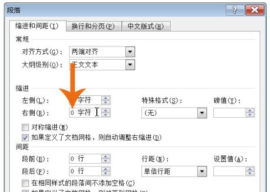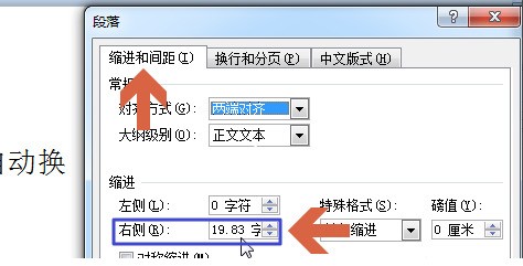 5. 如果想让文字在行尾自动换行,可将“右侧”选项的数值设置成“0”。
