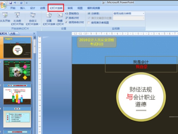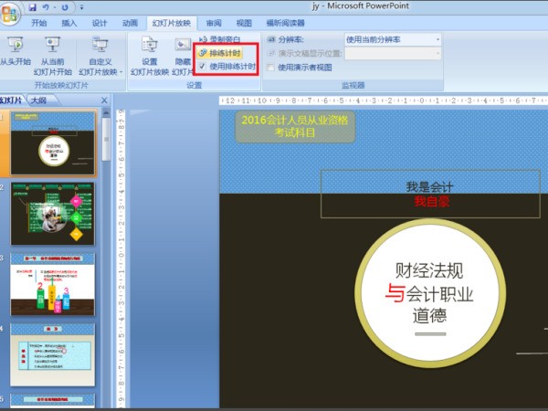 2、在菜单栏中找到”幻灯片放映“菜单,点击进去,在中间位置找到”使用排练计时“选项,打勾。