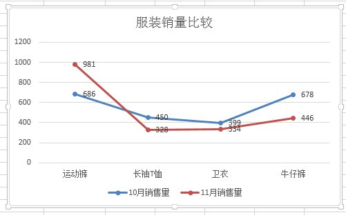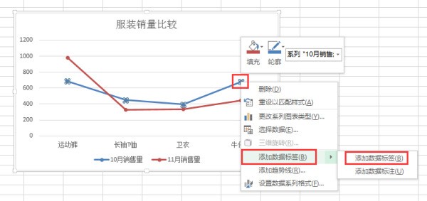 然后你就可以修改折线图标题,增加数据标签:分别在两条线上单击鼠标右键,在右键菜单里选择【添加数据标签】-【添加数据标签】,然后就成了你要的效果。