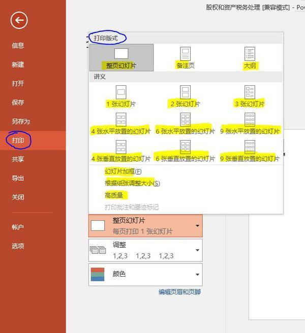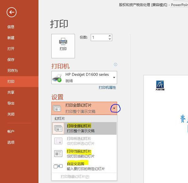 2、在“打印”选项中的“设置”中,选择打印范围:“打印全部幻灯片”、“打印当前幻灯片”或者“自定义范围”;