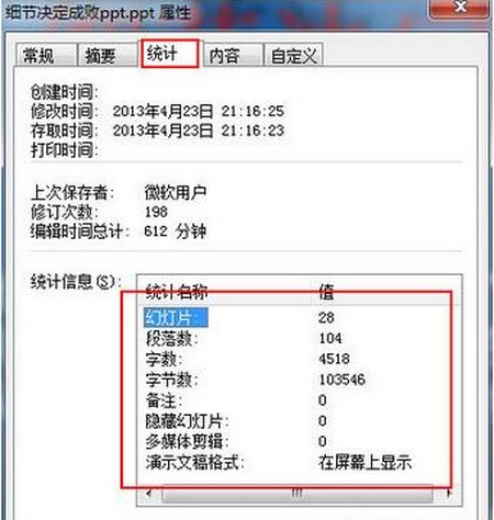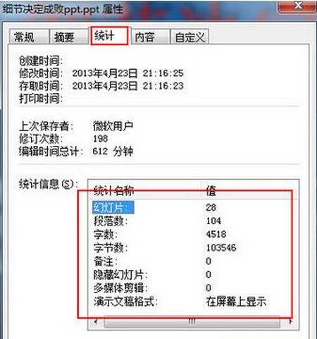 听换排 这样就会弹出这个幻灯片的高级属性的窗口。同样我们在切换到“统计”选项卡即可查看到文件的字数字节等信息。如图所示: