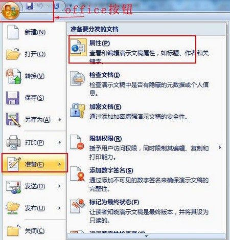 同样先用ppt2007版本打开需要统计的演示文稿,在点击左上角的office选项按钮,会弹出下拉框,依次选择“准备--属性”,如图所示: