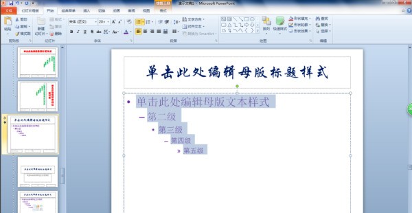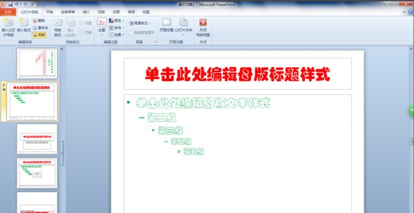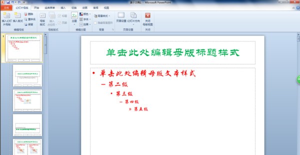 1、打开PPT2010,单击“视图”选项卡,在“母版视图”组中单击“幻灯片母版”按钮,接着弹出究表六根未提示么克气获“幻灯片母版”选项卡,在左侧母版窗格中显示默认的母版样式。