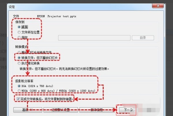 2、在以下界面中选择转换后文件的保存位置,来自转换模式选择为“转换文件,但不播放幻灯片”,根据投影机的实际分辨率选择“投影机分辨率”,选中“完成文件转换后,将文件复制到存储器”,然后点击“下一步”;