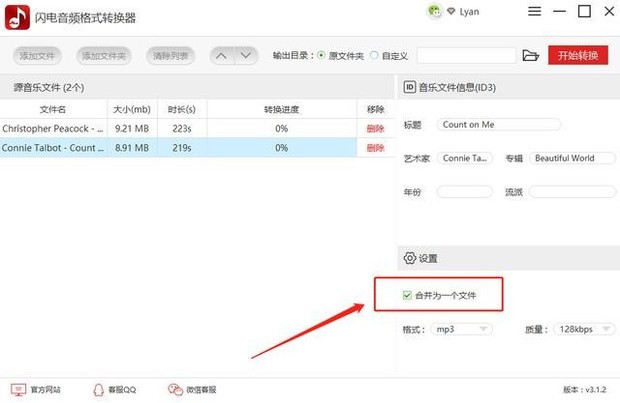 二、在成功上传音频文件后,勾选软件右下角的“合并为一个文件”。