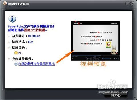 4、点击主界面右下角的"Start"按键即可开始将PPT转换视频。快速转换成功后,在最后显示的界面中“点击播放视频”,即可打开默认播放器预览到转换好的视频了。