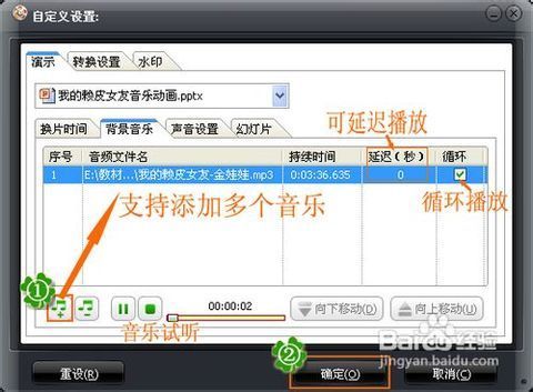2、点击“自定义”可进入自定义设置窗口,如图所示,选择“演示”-“背景音乐”,点击添加按键,将一个或多个音乐文件导入进来,音频格式几乎不限制哦。此外还可以设置延迟播放时间、循环播放、音频试听等等。
