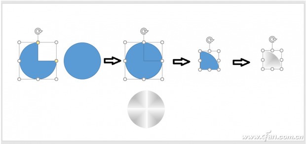 在幻灯片中绘制一个正圆,再绘制一个饼圆,将这两个图形叠放在一起后调整好它们的大小相同,同时选中它们,点击“格式”选项卡合并形状中的“剪除”,这样就绘制成四分之一的正圆。选定这个四分之一的正圆,设其填充为“渐变填充”,类型为“矩形”,方向处选择“从右上角”;两个渐变光圈,左边光圈位置为40%,选择其他颜色,红色、绿色、蓝色均为190;右边光圈位置为100%,选择颜色为白色;无线条。复制出这样的四分之一正圆3份,通过水平、垂直翻转调整好,将这4个四分之一正圆进行拼接,最后进行组合(图6)。