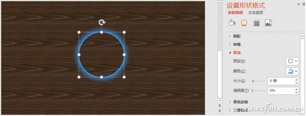 打开PPT2016,新建一张空白幻灯片,插入一个圆,并将它的填充设置为“幻灯片背景填充”(这样无论将圆拖动到哪里,都会以当前位置的背景图片进行自动填充)。接下来,将此圆复制出两个。选定第1个圆,在“形状选项”的“效果”选项卡中,将发光的“预设”设置为任何一种外发光,大小为40磅,透明度为50%,线条设置为“无线条”。选择复制出的圆,也设置成任何一种外发光,大小为9磅,透明度为0%,线条也设置为“无线条”。设置完成后,将两个圆进行叠加组合(图2)。