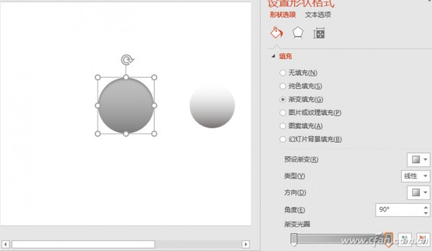 再画一个正圆,比上面的圆略小些,它的填充为“渐变填充”,类型为“线性”,方向处选择“线性向下”。两个渐变光圈,左边光圈位置为0%,选择颜色为白色;右边光圈位置为100%,选择颜色为灰色25%-深色50%;无线条。这样,按钮的背景圆形就制作完成了(图5)。