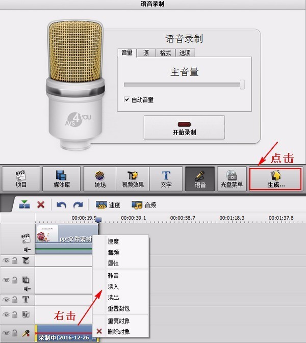 录制完成之后可以点击“停止录制”按钮或者是按键盘的空格键,下图就是录制完成之后的一个效果。右击声音轨道可以对录音的速度和音量以及其它参数进行调整,如果添加的视频是自带有音频的,则需要右击视频轨道选择静音,不然我们的配音就没有意义了,但如果觉得光是自己配音比较单调,那我们也可以添加一个纯伴奏的音乐作为背景,今天这里就不多做强调。所有的操作完成之后就可以点击权商“生成”了。