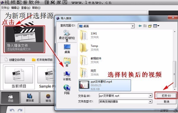 现在就要用到视频配音软件了,因为我们现在是要进行视频配音操作了。打开软件,点击“导入媒体文件”,在弹出的对话框中选择刚刚转换出来的视频文件,然后点击“打开”按钮,这样就把视频文件添加到配音软件中了。