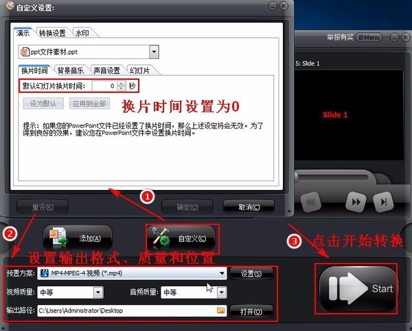添加ppt文件之后点击界面的“自定义”按钮,在自定义设置对话框的“演示”选项卡下把“默认幻灯片换片时间”设置为0,但是有相关前提,如果在制作ppt文件的时候对幻灯片的切换方式进行了设置,并且设置为自动换片时间,则这里需要更改为0,如果幻灯片切换方式是设置为单击鼠标切换,则这里的参数需要更改成其它数字,否则可能会出现转换不成功的情况。然后设置好输出的格式、质量和输出路径,最后点击右下角的开始转换按钮就行了。