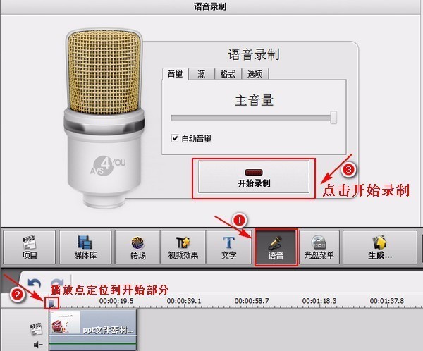 视频添加之后选择“语音”选项卡,然后把轨道上面的播放点定位到最开始的位置,然后点击上面的“开始录制”按钮。因为录制的时候是从播放点的位置开始录制的,所以我这里需要定位在最开始的部分,当然也可以根据自己的需要进行调整。