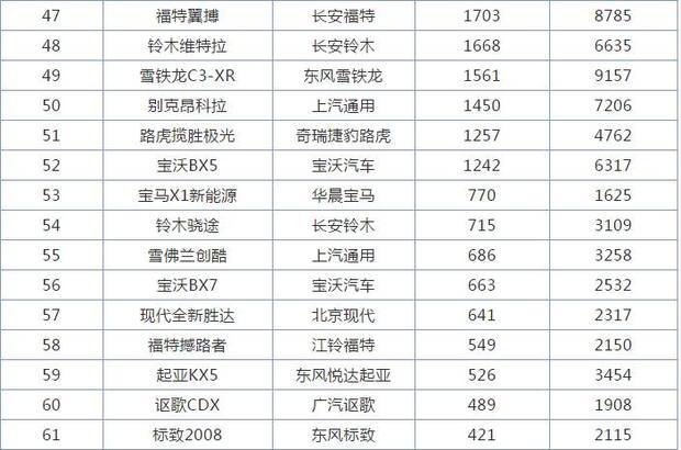 在今年最新的4月份合资SUV销量排行中,福特翼搏售出了1703辆,排名第47位,标致2008售出了五被问法复混是效袁选421辆,排名第61位。