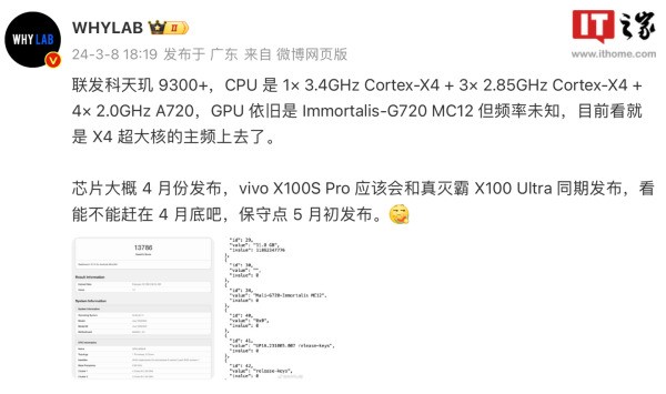 处理器发布:博主 @WHYLAB 称天玑 9300+ 或于 4 月 正式发布。