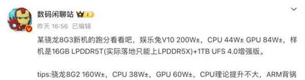 此前,该博主也曝光过疑似骁龙8Gen3的相关参数,“某骁龙8G3新机的跑分看看吧,娱乐兔V10 200W±,CPU 44W± GPU 84W±,样机是16GB LPDDR5T(实际落地只能上LPDDR5X)+1TB UFS 4.0增强版。tips:骁龙8G2 160W±,CPU 38W±,GPU 60W±,CPU理论提升不大,ARM背锅警告,自研GPU提升还行。”对比来看,天玑9300在CPU和GPU性能上均有望超越骁龙8Gen3,尤其是在GPU性能上可能略有优势。