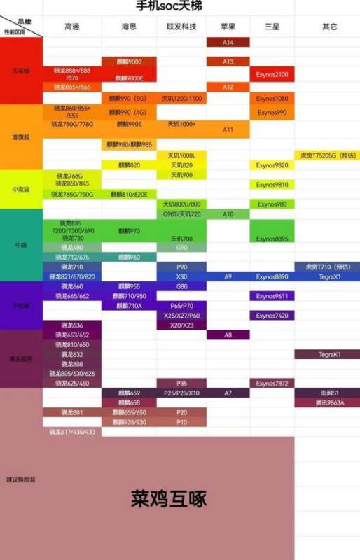 2021年手机SoC性能排行(基于SPEC06整数/功耗、曼哈顿离屏3.1帧数功耗及日常体验权重综合评估)如下,同格性能差距极小,上方芯片理论性能优势显著: