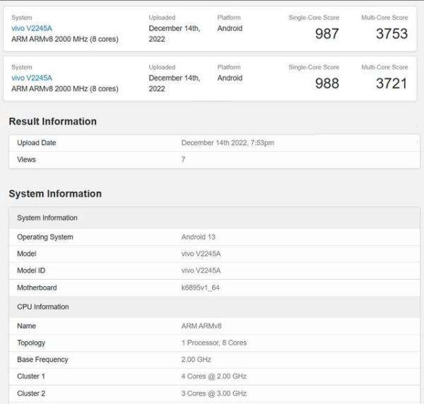 在Geekbench跑分平台上,一款型号为V2245A的vivo新机已经现身,按照此前的爆料,该机即为vivo S16 Pro。根据曝光的Geekbench页面截图来看,vivo S16 Pro搭载的是联发科天玑8200处理器,辅以12GB内存,运行基于Android 13的系统。该机单核跑分987,多核跑分3753,性能表现相当出色。
