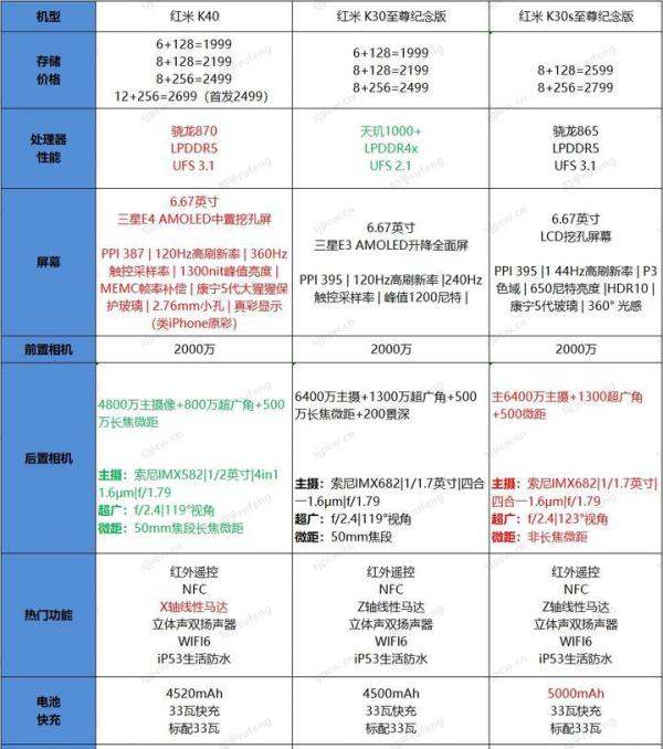 以下是红米K40、K30至尊版和K30S至尊版的配置参数对比表格: