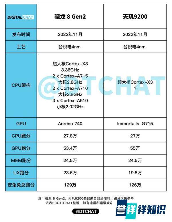 核心配置:基于台积电4nm工艺,采用全新X3超级大核CPU与Mail-G715 GPU。分项成绩:CPU部分27.3万分、GPU部分55万分、MEM部分24.6万分、UX部分19.5万分,GPU性能尤为突出。骁龙8Gen2性能对比跑分数据:骁龙8Gen2安兔兔总跑分129万分,略高于天玑9200。核心配置:同样采用台积电4nm工艺,CPU为“1+2+2+3”架构(含新一代X3超级大核),GPU为Adreno 740。分项成绩:CPU部分27.8万分、GPU部分53.4万分、MEM部分24.5万分、UX部分23.6万分,CPU与UX表现更优。