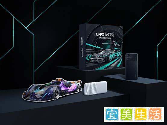 OPPO x 王牌竞速手游定制礼盒:外观采用光哑一体UV工艺,表面仪表盘及荧光线条设计极具速度感,打开可变为收纳盒。礼盒内除手机外,赠送OPPO官方18W快充移动电源、游戏权益兑换卡片。用户使用礼盒内的OPPO K9 Pro可享受王牌竞速游戏闪电启动和4D专属振感体验。