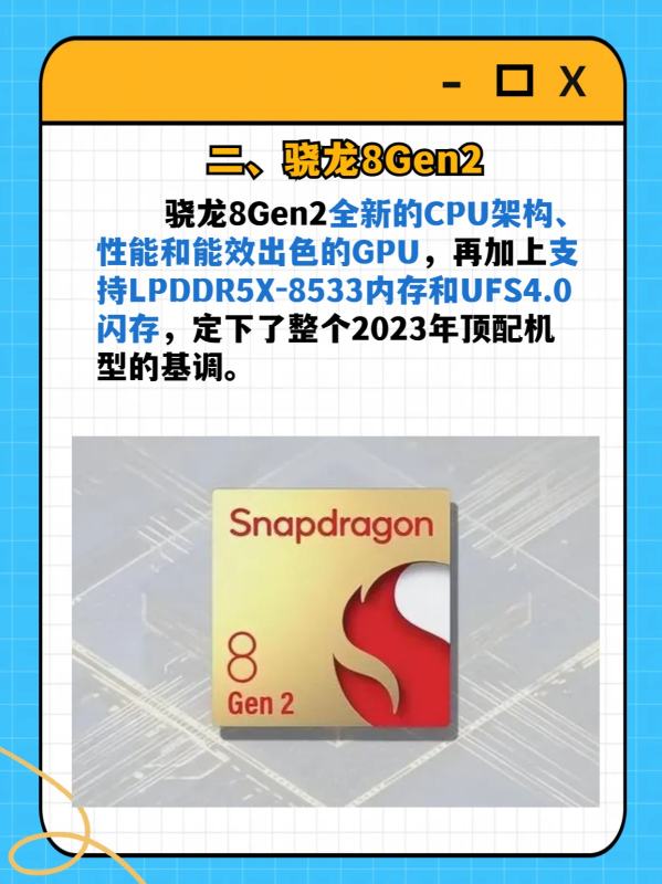 骁龙8Gen2全新的CPU架构、性能和能效出色的GPU,再加上支持LPDDR5X-8533内存和UFS4.0闪存,定下了整个2023年顶配机型的基调。