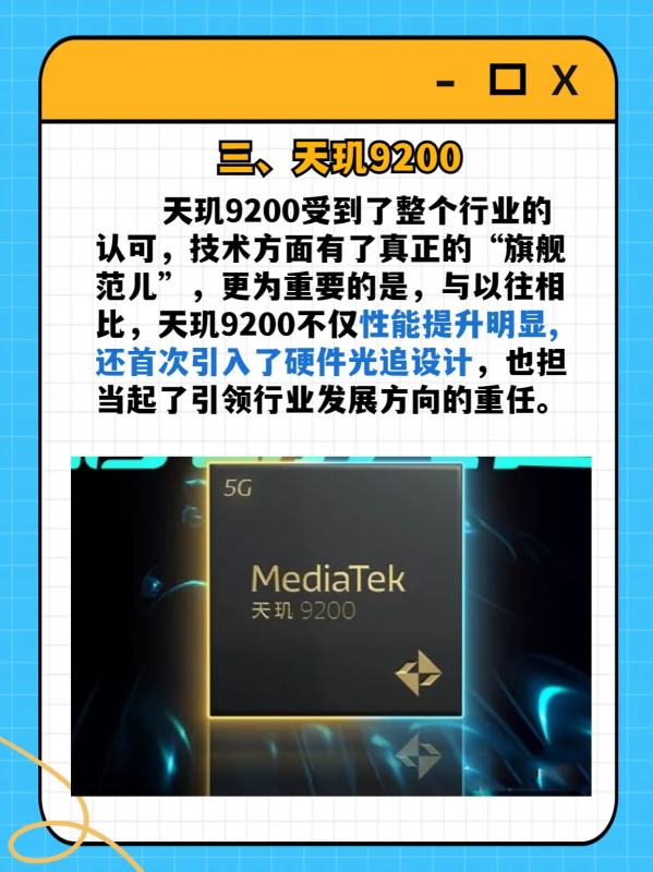天玑9200受到了整个行业的认可,技术方面有了真正的“旗舰范儿”,更为重要的是,与以往相比,天玑9200不仅性能提升明显,还首次引入了硬件光追设计,也担当起了引领行业发展方向的重任。