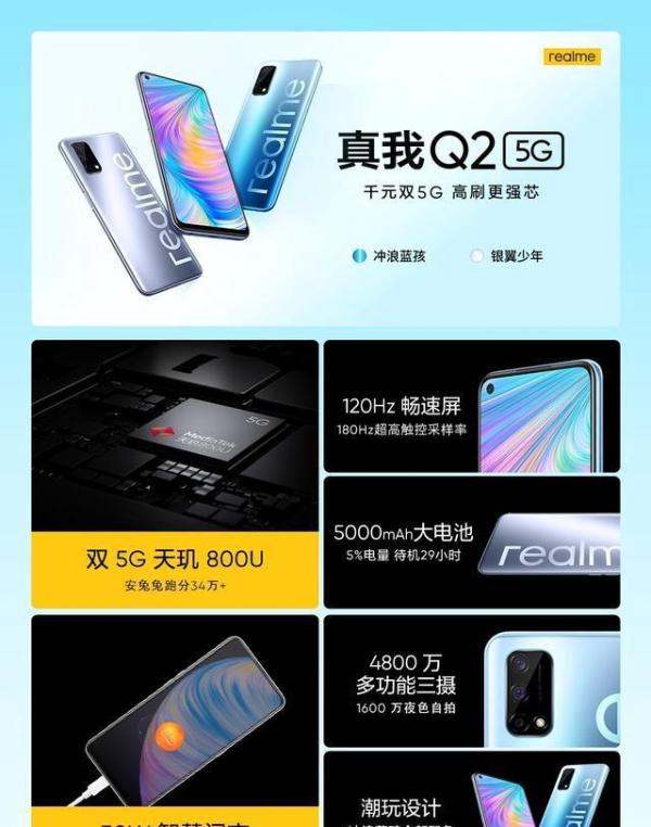 最便宜的天玑800U手机为realme Q2,其4+128GB版本首发价低至1199元。以下是该机的详细介绍: