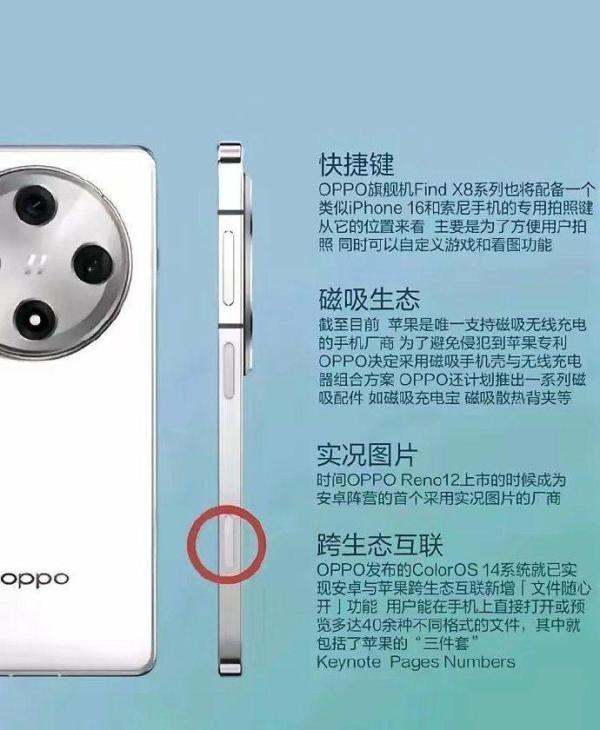 除了跑分信息外,网间还曝光了疑似OPPO Find X8系列新功能的渲染图。该系列机型或将加入固态影像按键,并带来磁吸生态、实况图片、跨生态互联等更多亮点。此外,从曝光的正面谍照来看,该系列新机或将放弃此前的流体云设计,改用居中灵动岛设计,四边框非常窄,整体外观更加时尚。
