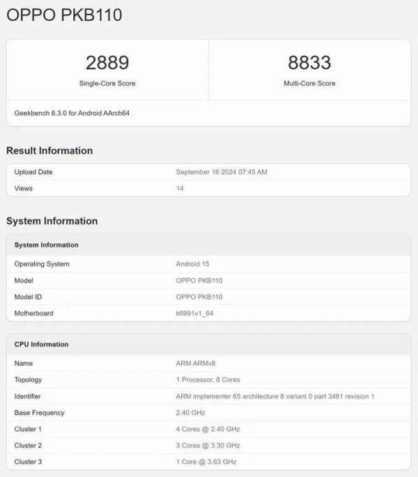 根据曝光的跑分截图,这款型号为PKB110的OPPO新机在Geekbench6上的单核跑分成绩为2889分,多核跑分成绩为8833分。这一跑分成绩明显比此前曝光的疑似vivo旗下搭载天玑9400处理器的机型要高,甚至不逊于苹果A18(此处可能存在笔误,因苹果最新处理器为A系列,如A16,而A18尚未发布,此处或为对比说明其性能强劲)和高通骁龙8Gen4。从处理器频率来看,该机搭载的处理器超大核为3.63GHz,大核为3.30GHz,小核为2.40GHz,与此前曝光的vivo新机一致,因此推测应该也是天玑9400处理器。同时,该机还配备了16GB运存,进一步提升了其性能表现。