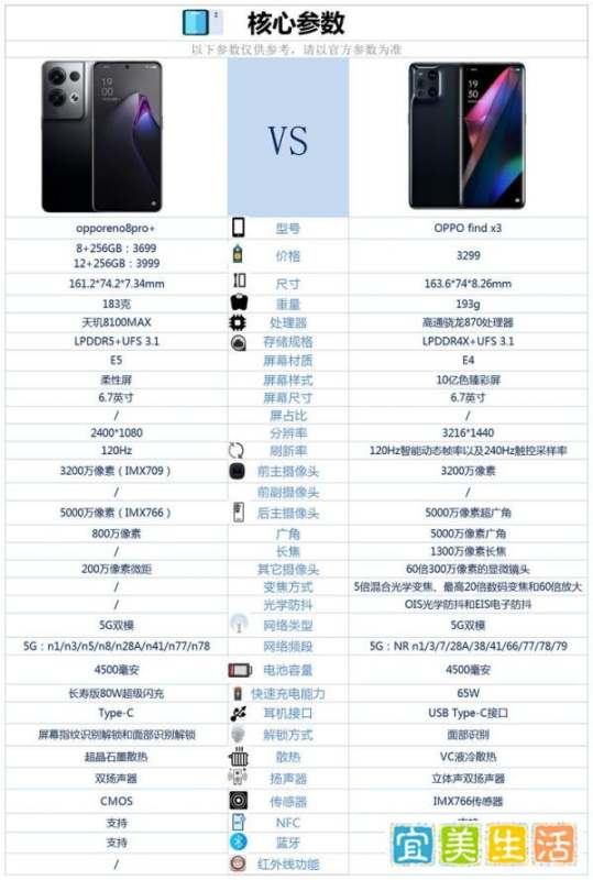 Find X5 Pro:后置三摄(50MP广角主摄+50MP超广角+13MP长焦),支持5倍光学变焦与20倍数码变焦。主摄与超广角均采用索尼IMX766传感器,支持OIS光学防抖。