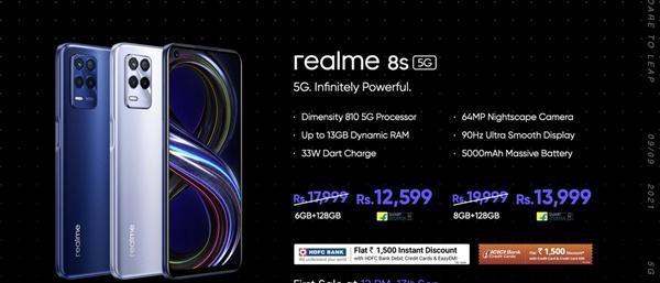 处理器配置:该机全球首发联发科天玑810芯片,CPU主频达到了2.4GHz,GPU为Mali-G57。内存扩展:支持内存扩展,最高可扩展5GB,也就是说8GB内存可以带来等效13GB内存的使用体验(realme 8s配备的是LPDDR4X内存)。屏幕配置:realme 8s采用6.5英寸LCD全面屏,刷新率为90Hz。摄像头配置:前置1600万像素,后置6400万AI三摄,具体包括6400万+200万+200万。电池续航:电池容量为5000mAh,支持33W快充。系统配置:出厂预装基于Android 11深度定制的realme UI 2.0操作系统,还支持MicroSD卡扩展。价格及发售信息:9月13日正式上市发售,两款配色可供选择。realme 8s 6GB+128GB版售价12599印度卢比(约合人民币1100元),8GB+128GB版售价13999印度卢比(约合人民币1230元)。