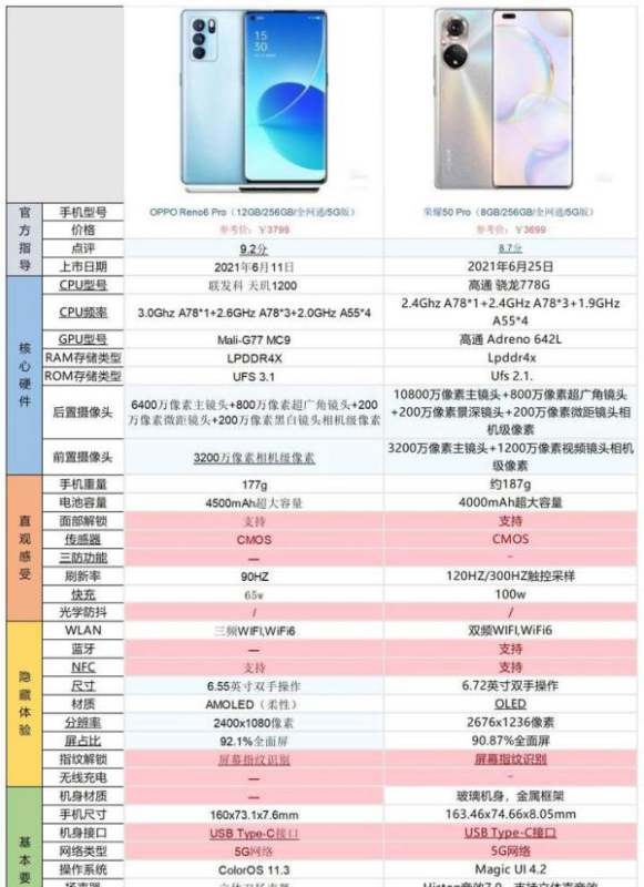 OPPO Reno6 Pro和荣耀50 Pro比较,同样3000多建议选择OPPO Reno6 Pro。以下是详细的分析对比: