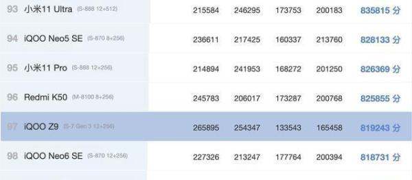 第七名:iQOO Neo7 SE(96.6万+),天玑8200处理器,性能与iQOO Z8接近。