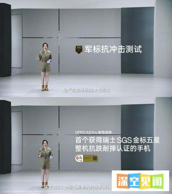 抗摔设计:前后盖采用旗舰级材质,正面搭载康宁?大猩猩?玻璃 Victus? 2,天青配色后盖首发OPPO晶盾玻璃;整机采用超抗摔金刚石架构,通过瑞士SGS金标五星整机抗跌耐摔认证及国家军用标准抗冲击测试,现场演示被汽车碾压后完好无损。