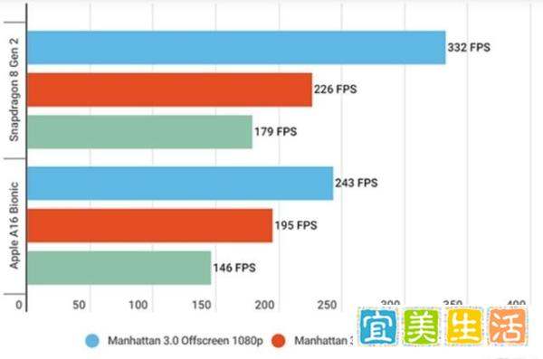 GFXBench Manhattan 3.0 Offscreen 1080p:骁龙8Gen2得分332 FPS,A16仅243 FPS,领先幅度达36%。GFXBench Manhattan 3.1 Offscreen 1080p:骁龙8Gen2得分226 FPS,A16为195 FPS,领先16%。Aztec Ruins Offscreen 1080p(Normal Tier):骁龙8Gen2得分179 FPS,A16仅146 FPS,领先23%。GFXBench 5.0 GPU测试:骁龙8Gen2平均65.4帧,A16为53.3帧,甚至落后于A15的53.6帧。