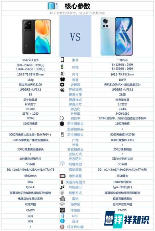 性能一加ACE搭载天玑8100MAX+游戏独显芯片+LPDDR5+UFS3.1,相比vivo S15 Pro的天玑8100+LPDDR5+UFS3.1,多了独立显示芯片,能提升游戏帧率稳定性并降低功耗,适合游戏玩家或高性能需求用户。