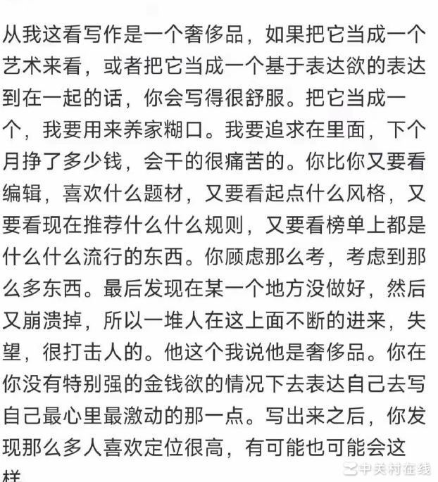 起点总编胡说在作者反盗版群中表示:写作应视为艺术创作,而非单纯谋生手段;唯有秉持艺术追求,作品才能真正打动人心、成就精品。
