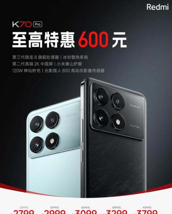 降价策略与市场定位:红米K70 Pro作为去年机型,通过最高降600元的策略(标准版低至2799元,电商平台甚至2600多元可入手),直接对标友商3500-4000元档骁龙8Gen3新机。此举不仅提前抢占性价比市场,还迫使友商新机定价承压,预计性价比机型将集中在2799-2999元区间。红米K70 Pro凭借2K屏、120W快充等越级配置,降价后性价比超越95%同类机型,尤其适合追求大内存的用户(24GB+1TB版仅3799元)。