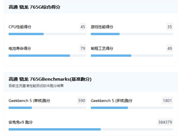 高通骁龙765G:8核芯片组,于2019年12月4日发布,采用7纳米工艺技术制造。它具有2400 MHz的1核Kryo 475 Prime(Cortex-A76),2200 MHz的1核Kryo 475 Gold(Cortex-A76)和1800 MHz的6核Kryo 475 Silver(Cortex-A55)。GPU采用Adreno 620;RAM采用LPDDR4X-2133存储芯片;使用骁龙X52基带芯片,提供5G 3.7Gbps/1.6bps传输速率,LTE 1.2Gbps/210Mbps传输速率。TDP功耗8W。