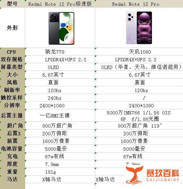 其他配置(完全一致)屏幕:6.67英寸AMOLED直屏,2400×1080分辨率,120Hz刷新率,1920Hz高频PWM调光,支持侧边指纹解锁,显示效果和护眼能力相同。续航:5000mAh电池+67W有线快充,48分钟左右充满,续航表现一致。周边配置:杜比全景声双扬声器、X轴线性马达、3.5mm耳机孔、NFC、红外遥控、IP53防水、WiFi 6、蓝牙5.2等,功能全面无短板。外观材质:塑料中框+玻璃后壳,厚度均为7.9mm,质感接近。总结建议选红米Note 12 Pro极速版:若经常玩大型游戏、多任务处理,或对机身重量敏感,骁龙778的性能和181克的轻量化设计更符合需求。选红米Note 12 Pro:若热爱摄影,尤其注重成片稳定性和低光表现,IMX766+OIS的组合在同价位几乎无对手,是更优选择。