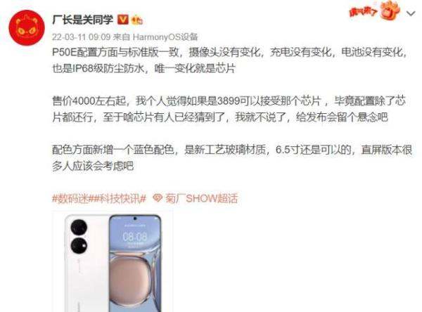 价格预测:根据数码博主的爆料,华为P50E的预计售价在4000元左右起。这一价格定位使得华为P50E在同类产品中具有较高的性价比,能够吸引更多消费者的关注。
